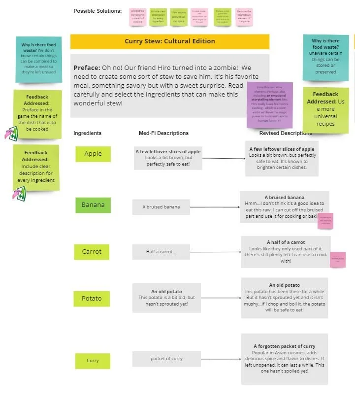 The topic of practicing food sustainability can feel overwhelming, and there are many angles to address the problem space. Our solution is a digital game experience that helps players use leftover ingredients resourcefully at the consumer level.