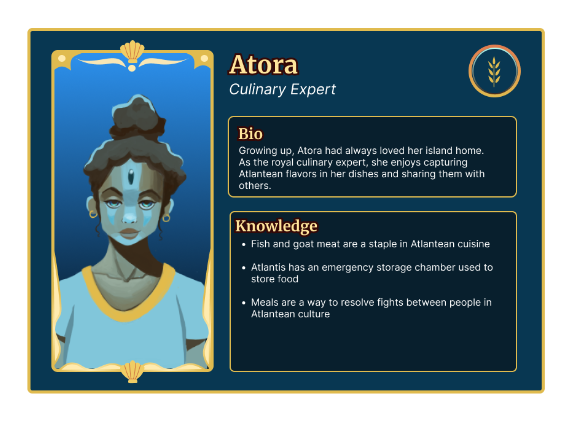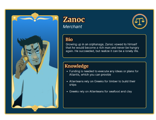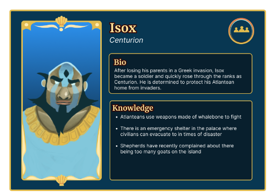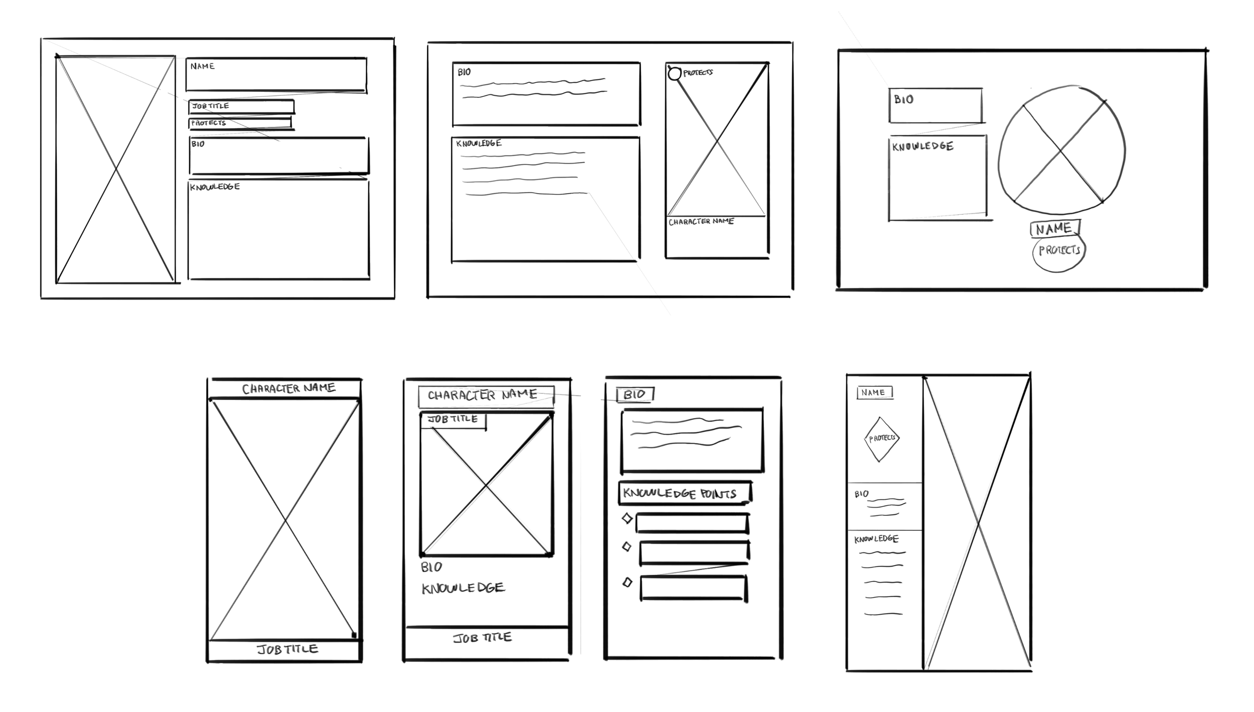 Once we locked in the important aspects of both games, such as the character’s name, job title, biography and knowledge, we went back to visually iterating what the character card can look like. We realized in our iterations that the character sheet would be the most information heavy sheet, so this had the highest priority for visual fidelity.