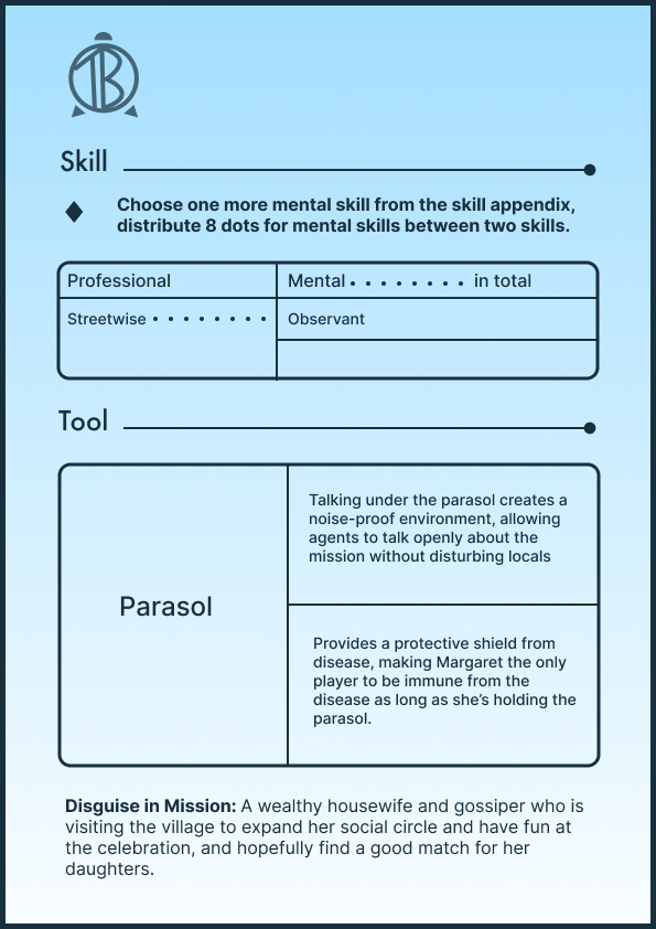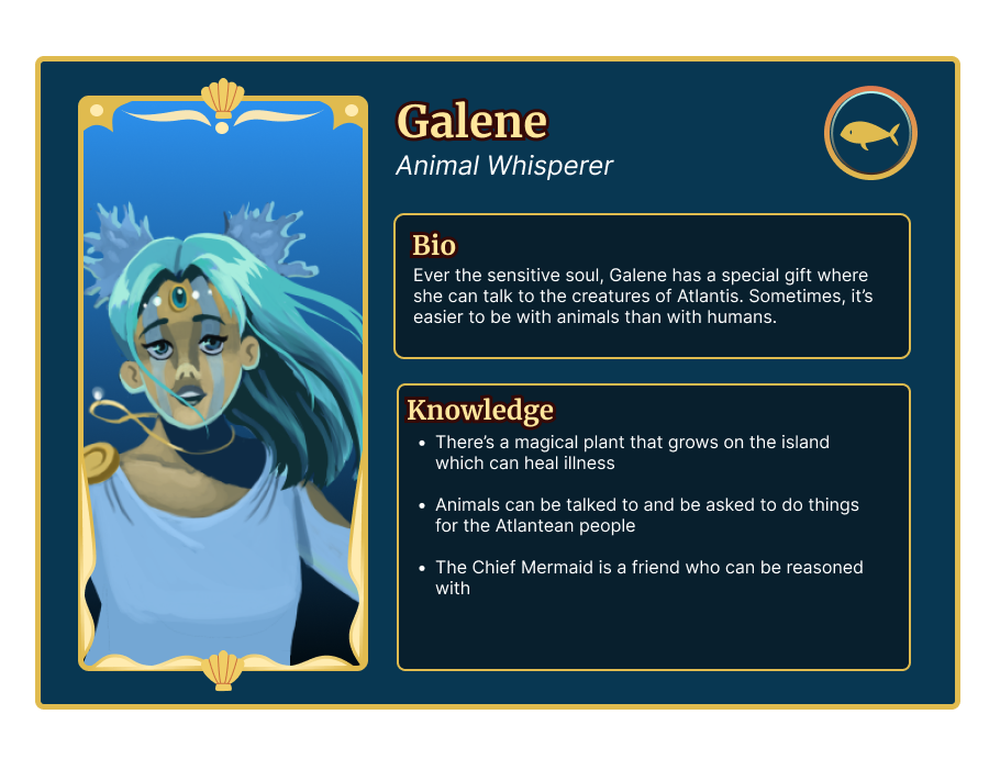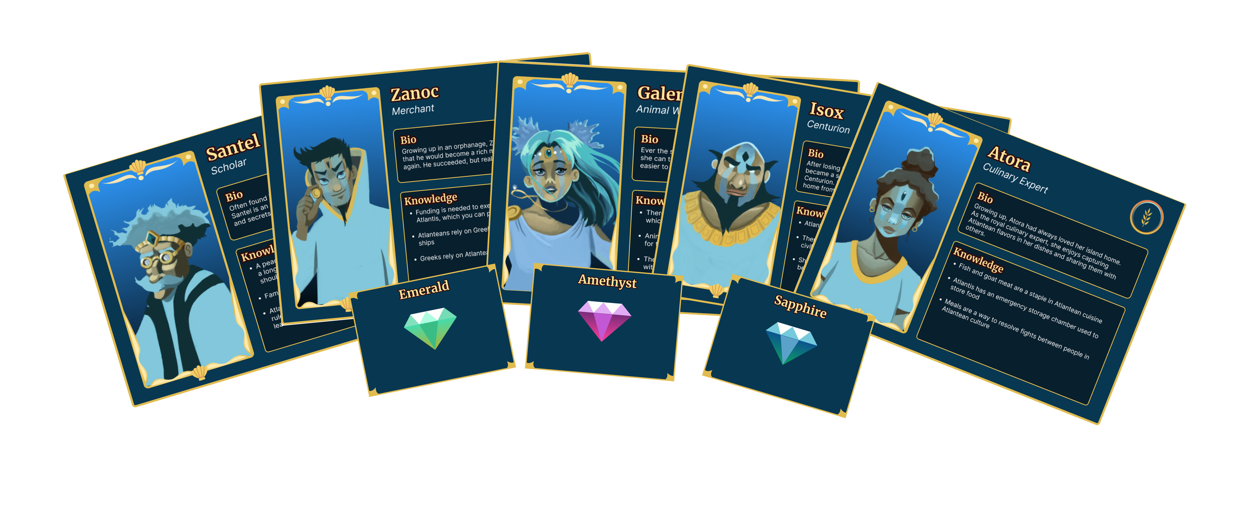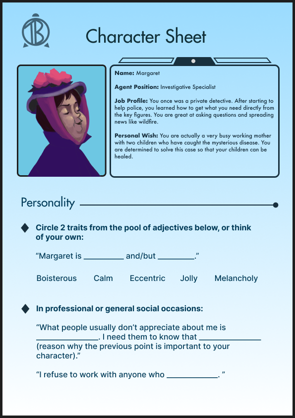 Character sheets to let players embody different backstories, special knowledge, and relationship dynamics with other characters.